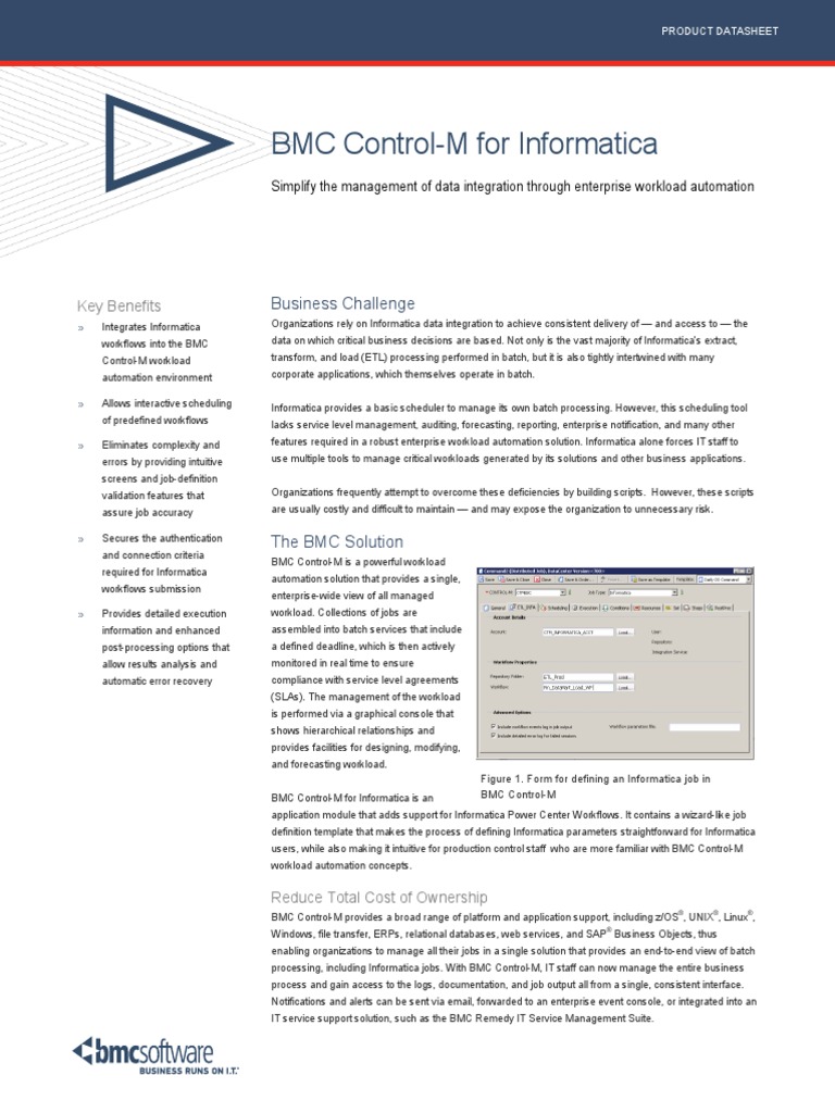 Gur Steif Vice President BMC CONTROL-M and BMC CONTROL-D Line of Business BMC Software Focus on Business Services not IT BMC CONTROL-M Business Process Components Integration Suite is an automation broker that BMC CONTROL-M Business Process enables managing batch jobs and real-time Integration Suite provides a simple way to processes as a. Name the different types of OLAP. The control-m agent interacts with the web service hub that can interact with the PowerCenter env.