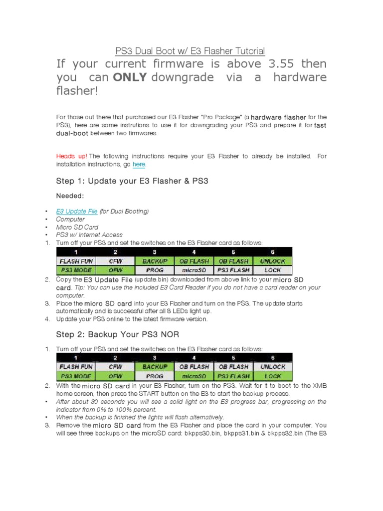 Turn off your PS3 and set the switches on the E3 Flasher card as follows. Safely remove sd card from PC and insert into e3 flasher. However there is a firmware file that breaks this limit and allows you to downgrade unlimited consoles with only one E3 NOR Flasher.