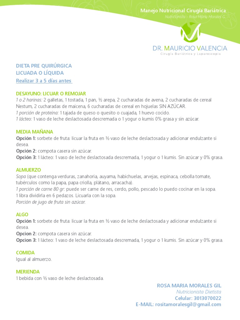 Dieta pre cirugia bariatrica pdf. Líquidos primeras tres semana Cuente a partir del día de la cirugía. Los cronómetros son útiles para controlar con precisión los 15 minutos de consumo de líquidos y. Se indicará el día previo a la cirugía dieta líquida liviana y ayuno de 8 a 12 horas.